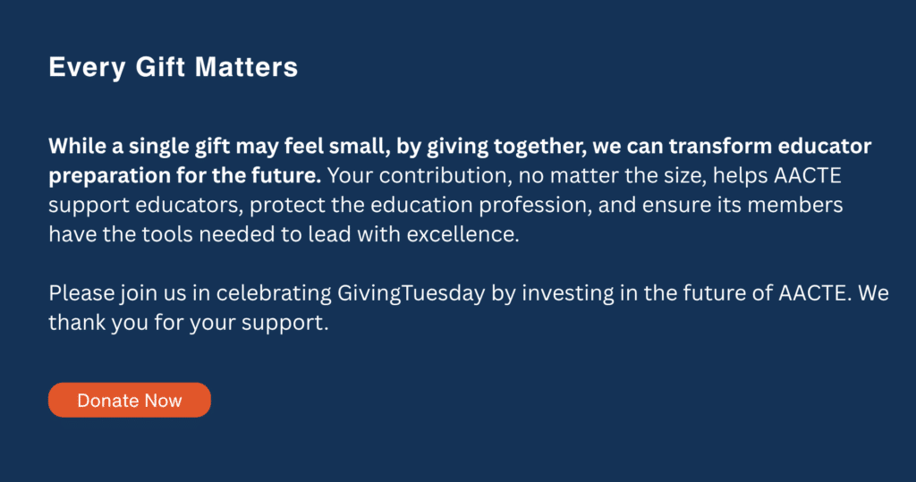 This GivingTuesday, AACTE invites you to stand Together for Students, Together for Educators. Your gift strengthens educator preparation, fuels AACTE’s advocacy and research, and empowers the educators who change lives every day.